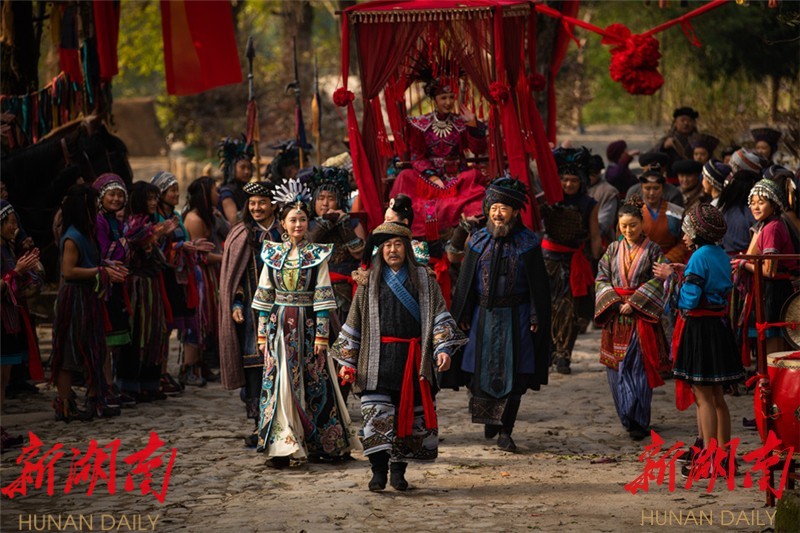 孟凡耀: 目前,我国电视荧屏上真正的少数民族题材作品较少,专门反映土家族生活的影视作品就更稀缺了。我对湘西,对土家族有感情渊源。2012年在湖北恩施拍摄电视剧《血誓》时,我们走进了土家族的生活,看到了土家族的民俗、民风、民情,就感到土家族有厚重的历史文化可挖掘,感到土家族是一个很有故事的民族。如何讲好土家族故事,如何把土家族的历史及文化挖掘出来,这就需要我们扎根生活,体验生活,真正准确地把土家族的历史文化及文明进程反映出来,就需要踏踏实实地实地采风。前年在湖南洪江区拍摄《一代洪商》时,就了解到龙山县惹巴拉了。“稀少为贵”,这些年来就是想拍一部少数民族题材的作品,由于多次来到神秘的湘西大地,体验到我们土家族优秀的历史文化,便产生了创作的欲望,所以就有了今天《血盟千年》这部电视剧。