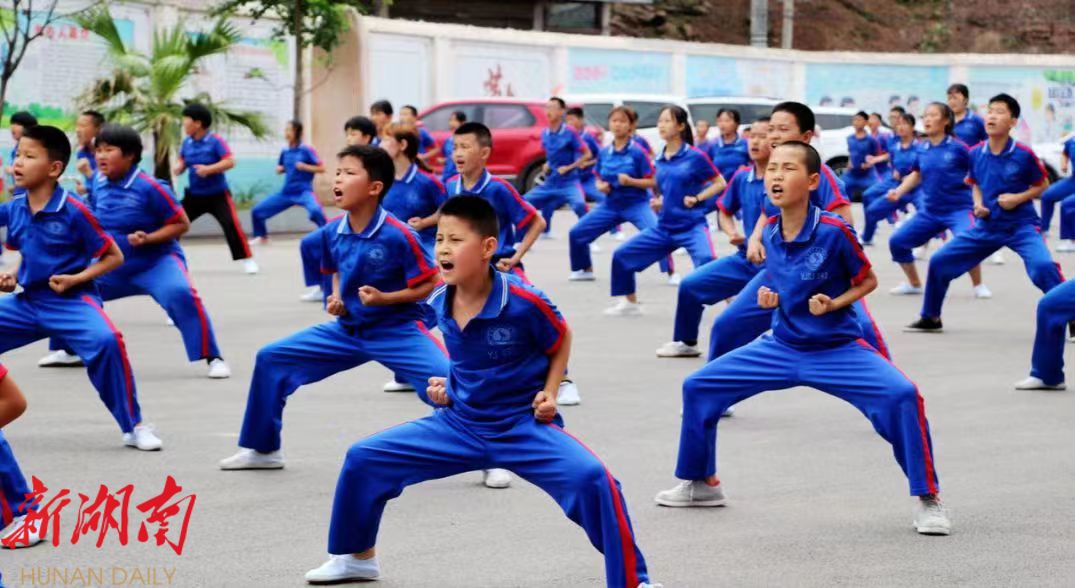 湖南日报·新湖南客户端4月25日讯 (通讯员 龙芳)“嘿,哈,嘿……”青葱四月,在桑植县德兴高级中学 宽敞的操场上,清晨的雾气还未散去, 铿锵有力的操练声阵阵传来,几百名身着校服的同学在教练的带领下一起做着武术操,一拳一掌打得虎虎生风、整齐划一。