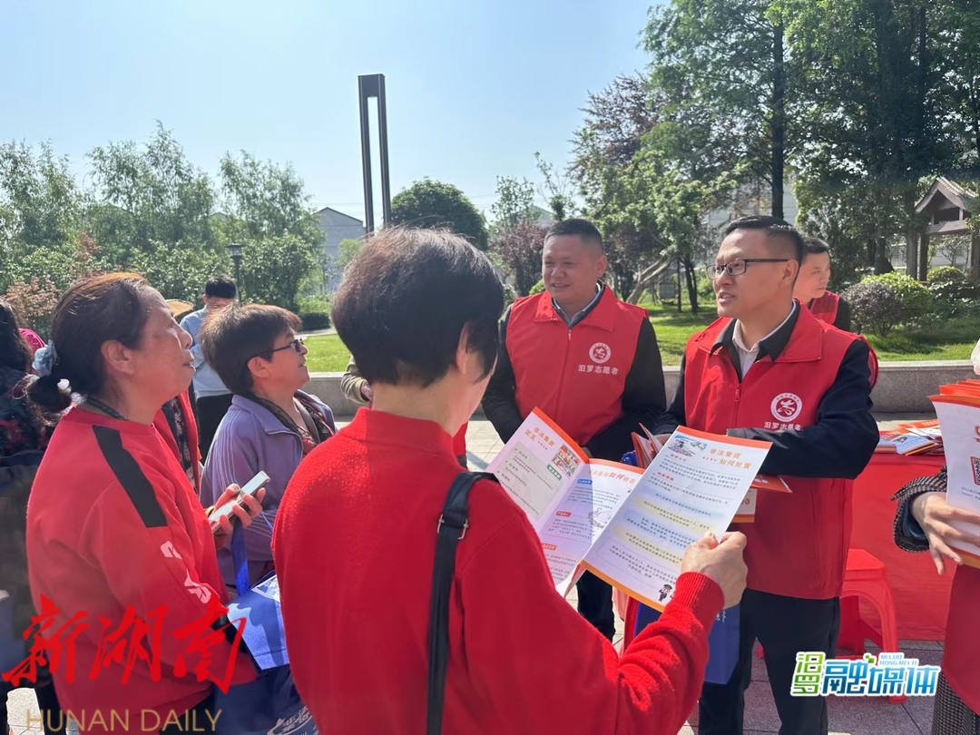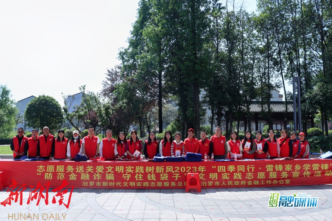 湖南日报·新湖南客户端4月26日讯(通讯员 夏凡)志愿服务送关爱,⽂明实践树新⻛。4月26日上午,汨罗市2023年“四季同⾏·雷锋家乡学雷锋” “防范金融诈骗,守住钱袋⼦”⽂明实践志愿服务宣传活动,在欢乐水岸广场开展。