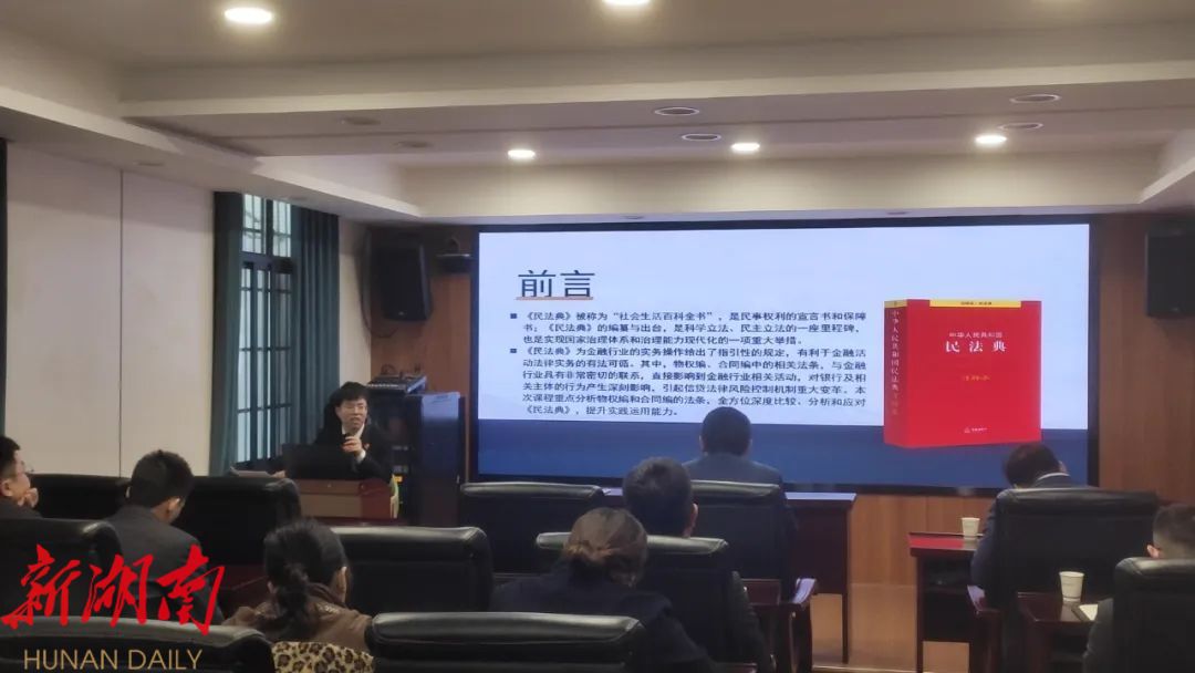在中国农业银行股份有限公司古丈支行,古丈县人民法院法官助理向乐以《民法典对银行业务的影响分析》为题,结合时事热点、银行信贷业务常见的法律风险,详细解读了《民法典》物权编、合同编。针对担保物权,特别是抵押权的相关法律规定,以及审查抵押财产、签订金融借款合同应当注意的问题进行深度讲解,引导业务人员增强法律意识、责任意识,规范金融业务流程。