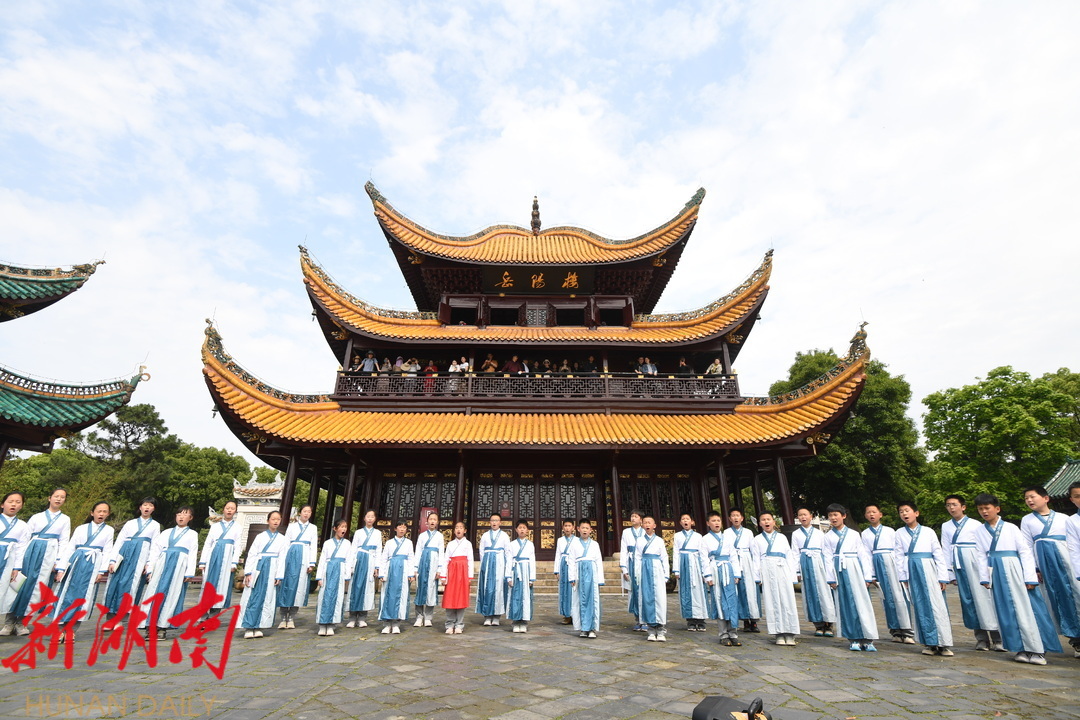 4月27日,岳阳市岳阳楼小学五年级学生在岳阳楼下诵读千古名篇《岳阳楼记》。 湖南日报全媒体记者 田超 摄