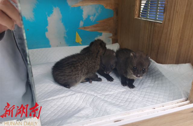 湖南日报·新湖南客户端5月15日讯(通讯员 陈爱军)5月9日,芷江县林业局接到新店坪镇水上村铁路养护工刘先生救援电话,称清理铁路两旁杂草时发现三只类似野猫的野生动物。接到救援电话后,芷江县林业局立即派出野生动植物保护站工作人员前往现场实施救助。经鉴定,确定类似野猫的野生动物是国家一级保护动物小灵猫幼崽。芷江县林业局野生动植物保护站迅速组织专业人员对小灵猫进行医疗救治。但由于小灵猫太小我站救助条件有限,于下午将小灵猫护送至怀化市野生动物救助中心进行饲养。目前救助站工作人将小灵猫放置在保温箱中精心饲养,经市救助站工作人员对三只小灵猫身体状况进行检查状况良好。
