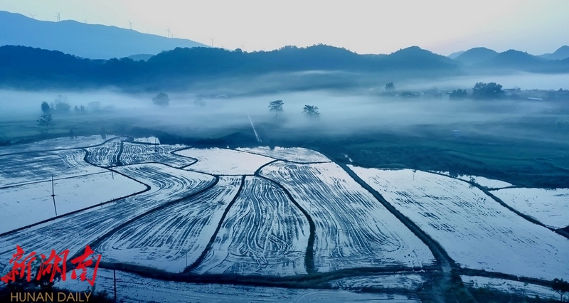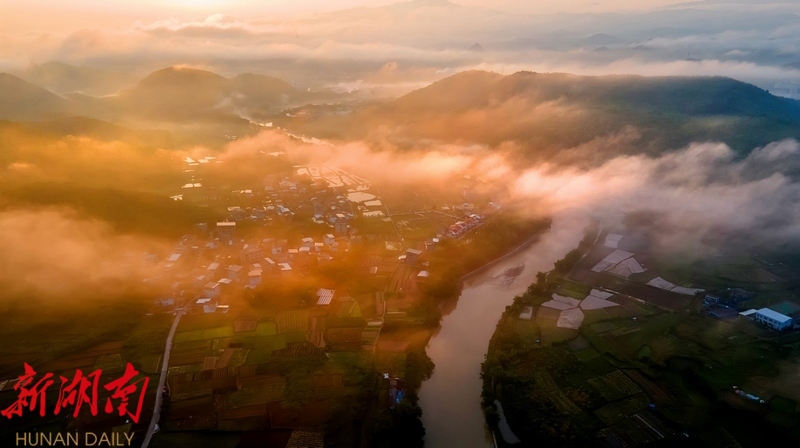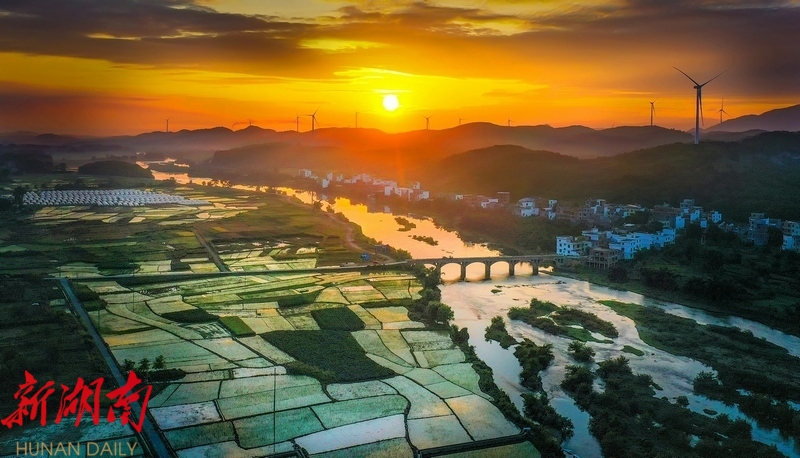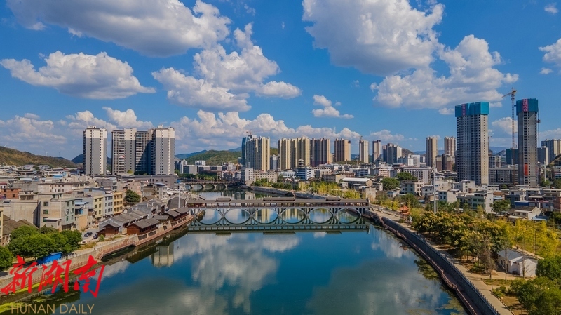 永明河在县城上游汇聚掩水、警水后穿城而过。云津桥从老县城南门横江而卧,桥始建于南宋淳熙年间,石墩木板桥面。站在云津桥上,北望水势如带,澄泓澈底,与蓝天同色,这就是永明八景第一的“潇水拖蓝”。周鹤有诗赞曰:“长天同色落寒汀,澄尽沧波淡醁醽。欸乃数声残照远,白鹤飞破一江青。”绝胜的潇水同时也是古城的天然护城河,南门通过云津桥与城南相连,易守难攻,守护安宁。潇水继续东流,汇集瀑带水、海会水、兴化水、雷洞水、夏湾水、洪洞水、神湾水、桐口水等大小数十支流,东北经桐口村,出道县桐溪尾。潇水两岸田畴肥沃,水利便捷,物产丰富,不仅养育了一方人民,还培育了质朴淳厚的一方民风。