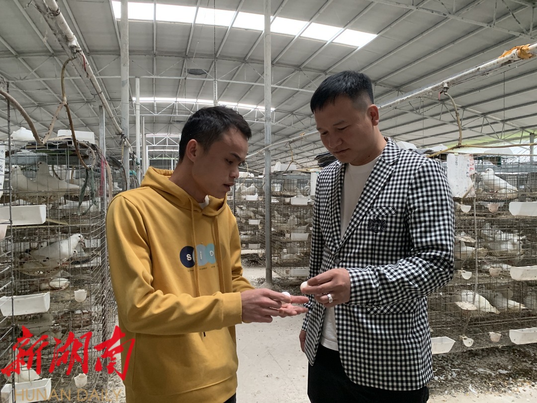 今年34岁的村民周易全原来一直在县城里从事餐饮工作,可随着疫情暴发,让他的事业陷入了低谷。周易成在知道了他的情况后,主动带他参观了自己养鸽场,邀请他共同发展乳鸽养殖。