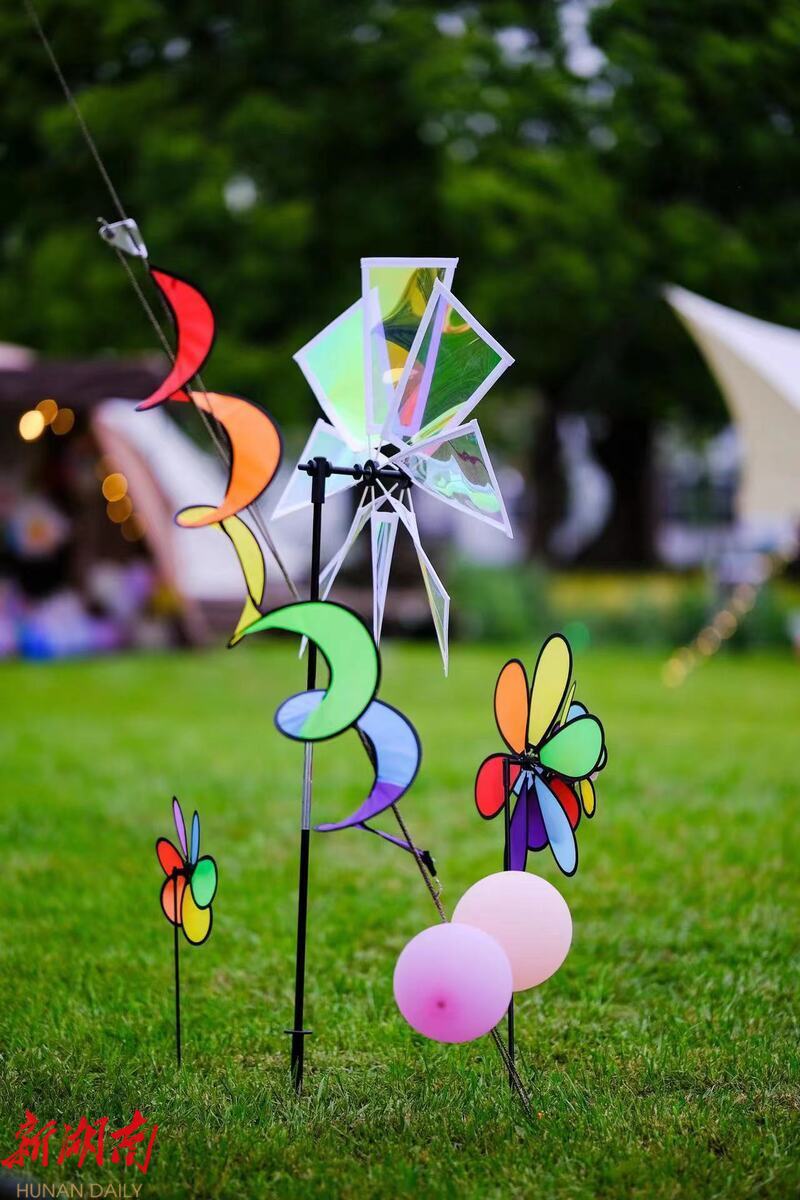 竹马营地内,天幕的风绳用气球、风车、彩带等加以标识,避免因不注意而绊倒奔跑中的孩子。