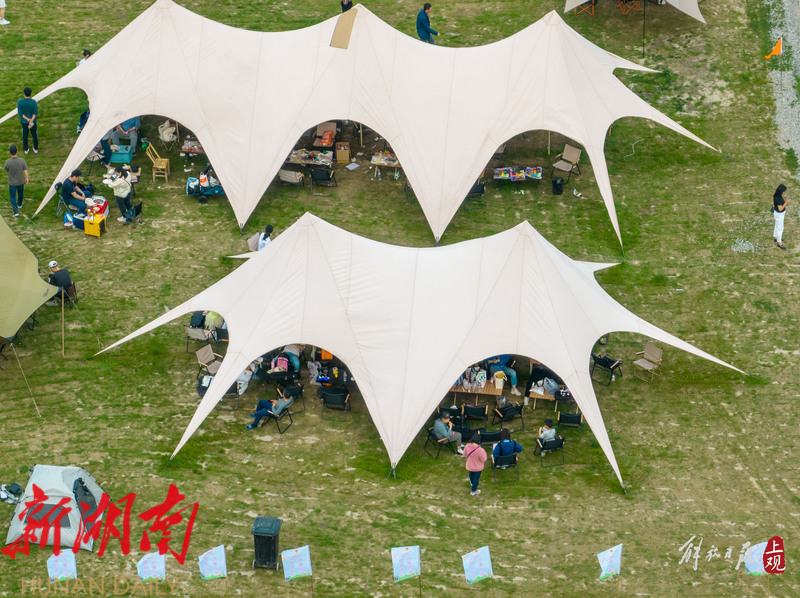 世纪公园的草坪上,大型天幕一拉,细细的风绳向四周延展,占用了好几个帐篷的面积。