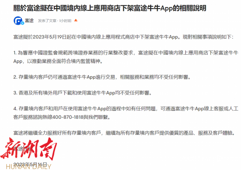 其中,富途控股称,拟于2023年5月19日起在中国境内在线应用程序商店中下架富途牛牛App。老虎证券称,将于2023年5月18日起在中国内地应用市场下架旗下APP“老虎国际”。