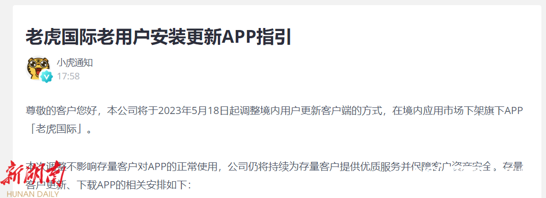 而据老虎证券公告,公司将于2023年5月18日起调整境内用户更新客户端的方式,在境内应用市场下架旗下APP“老虎国际”,“本次调整不影响存量客户对APP的正常使用 ,公司仍将持续为存量客户提供优质服务并保障客户资产安全。”