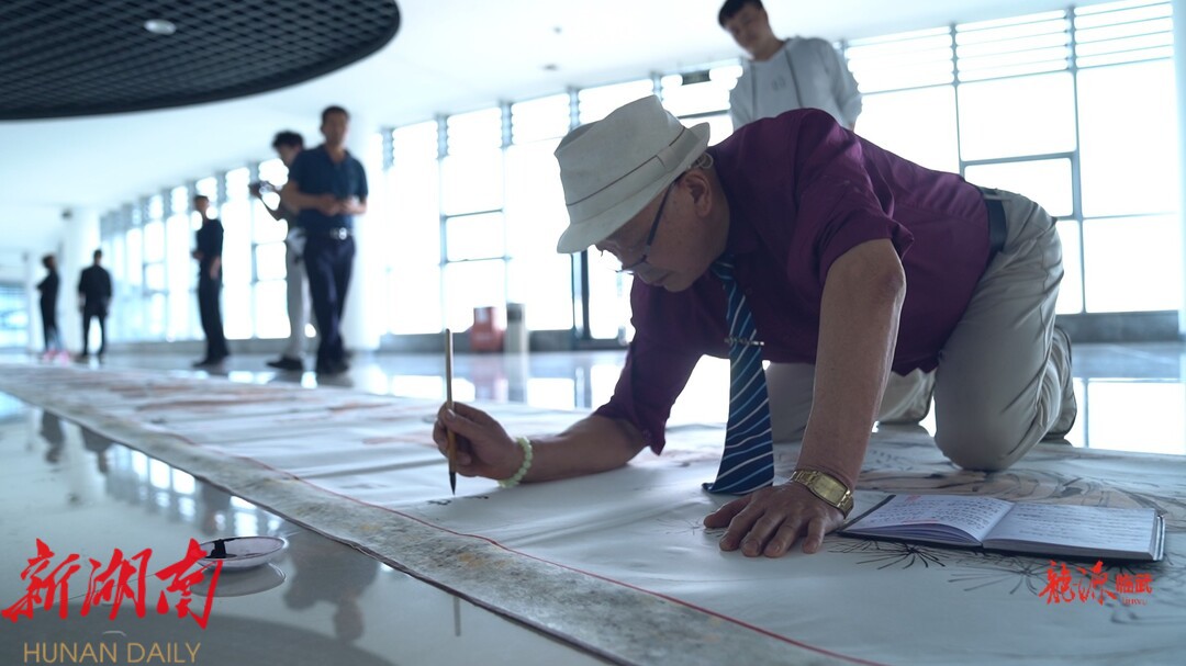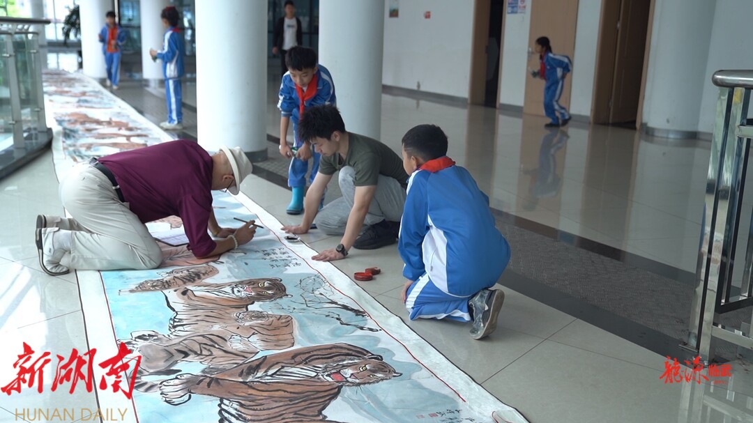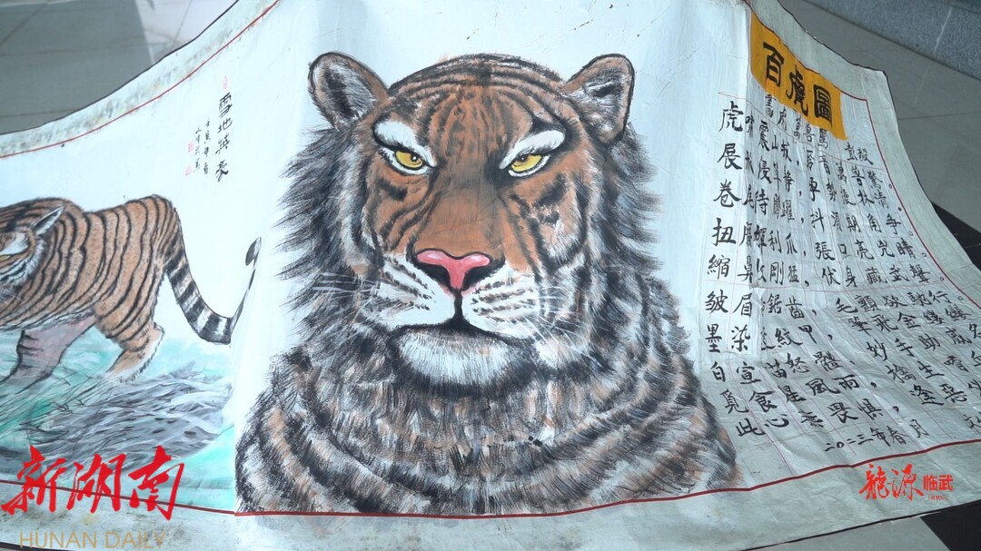 在临武县文体中心,书画家文仲武正在为自己即将完成的“百虎图”题词印章,100只神态各异、惟妙惟肖的老虎引来了过往市民的驻足观赏。