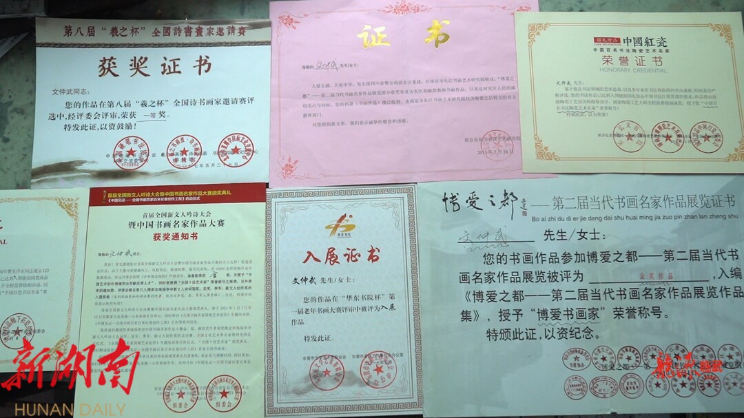 一分耕耘一分收获。正是文仲武这份对绘画的执着,他在艺术创作的道路上也收获颇丰,近年来,文仲武的书画作品在全国和全省的书画大赛中多次获奖。他的书法作品七律诗《咏羊》在2017年第八届“羲之杯”全国诗书画家邀请赛中荣获一等奖,被授予“中华老年兰亭文艺家”荣誉称号。中国画《奔马》在2021年首届全国新文人吟诗大会暨中国书画名家作品大赛中荣获金奖,并被授予“全国十佳艺术家”荣誉称号。2017年,他被聘请为中国诗书画家网高级诗词家、高级书画家。