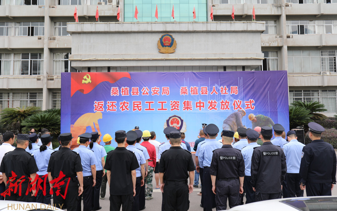 桑植融媒5月18日讯(记者 张芬 通讯员 唐吉伟)近日,桑植县公安局成功破获一起拒不支付劳动报酬案,抓获犯罪嫌疑人1人,成功为189名农民工追回薪资178万元。5月18日,桑植县公安局联合人社局举行农民工工资集中发放仪式,县公安局党委副书记、政委黎昌辉,县公安局、县人社局相关工作人员、拖欠薪资农民工代表参加仪式。