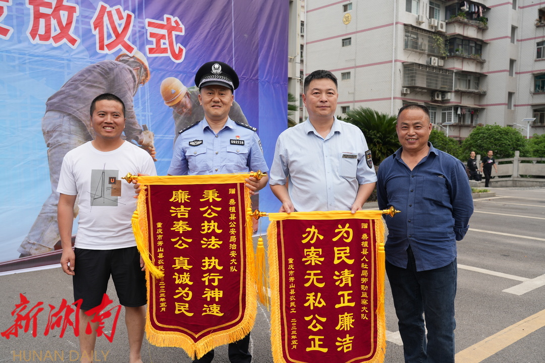“我们终于拿到工钱了,感谢党委政府,感谢县公安局,感谢县人社局,你们辛苦了!”仪式上,农民工代表将“秉公执法 执行神速”“为民清正廉洁 办案无私公正”等字样的锦旗送到县公安局民警和县人社局劳动监察大队工作人员手上,以表达为他们讨回薪资的真挚感谢。
