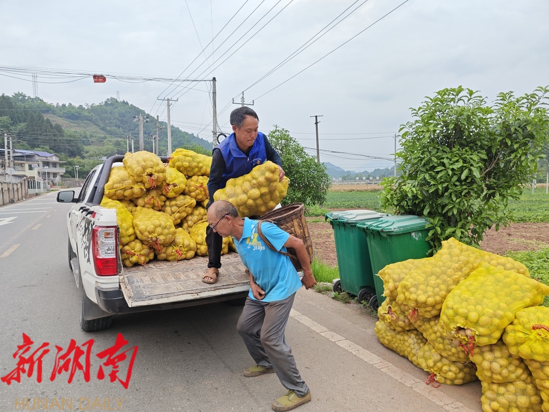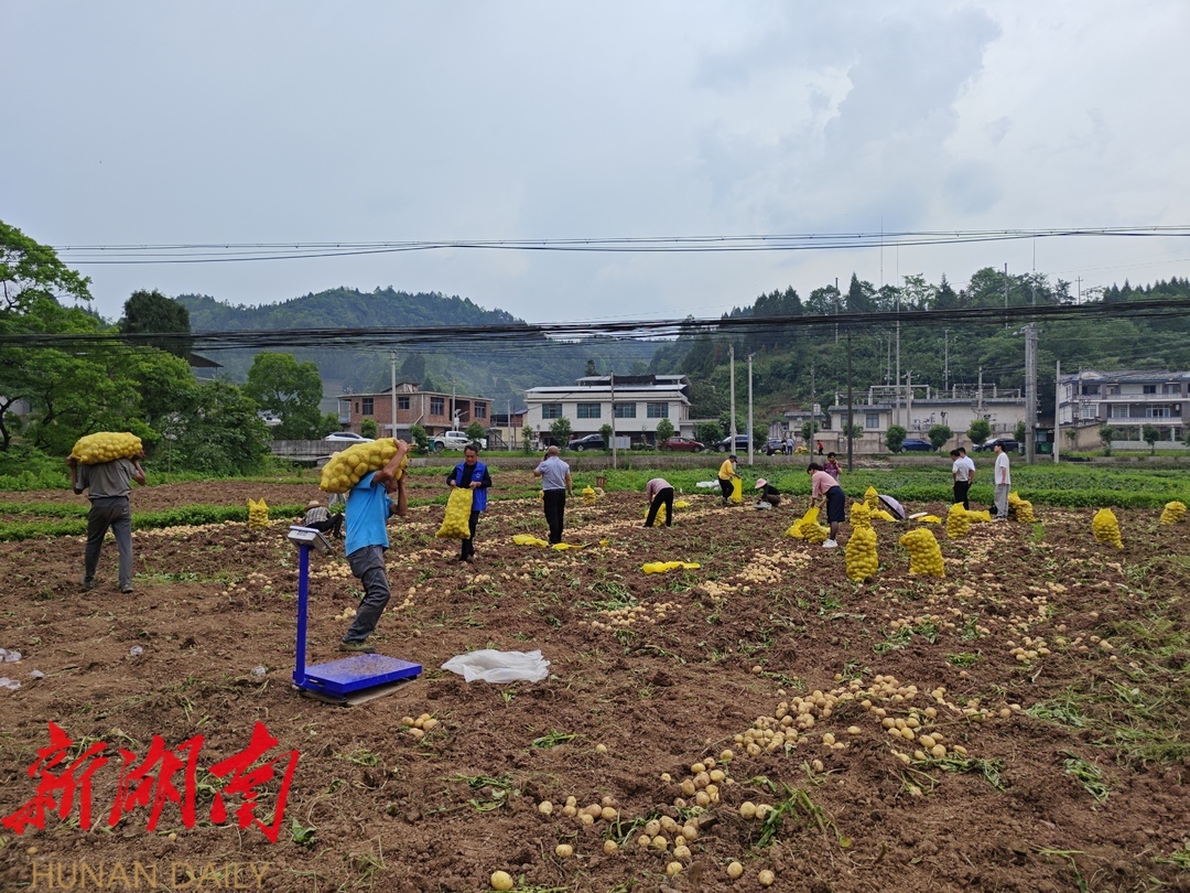 湖南日报·新湖南客户端 5月19日讯(记者 朱丽娟 方淑群)5月18日,在芙蓉桥白族乡梅家桥村桑植县辉进生态家庭农场的“三分地养活一个人”(以下简称“三一工程”)粮食高产绿色优质科技创新工程示范基地里,10多名工人正忙着采挖成熟的马铃薯,一个个红色、黄色、黑色的马铃薯陆陆续续被工人们从地里翻了出来,工人们将一堆堆身材“硕大”的马铃薯拾捡、装袋、称重、装车,准备运往各个订购点售卖,田间地头一派繁忙的丰收景象。