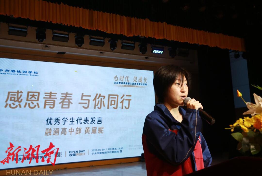 获得美国加州大学欧文分校、加州大学戴维斯分校、英国伦敦国王学院和爱丁堡大学等多所英美顶尖学府录取的融通高中优秀学生代表黄黛妮同学分享了她在宁乡市碧桂园学校的成长历程。