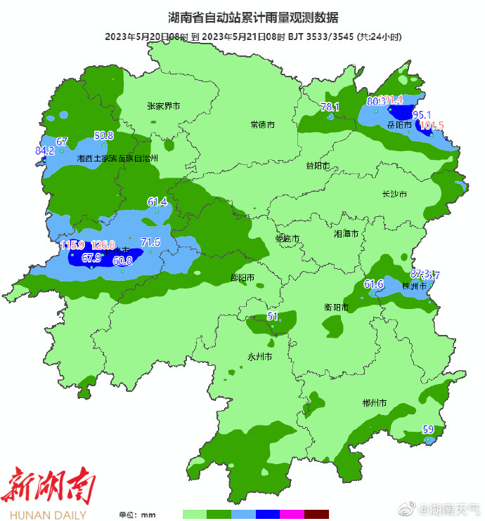 【20日怀化岳阳等地出现暴雨大暴雨】20日08时至21日08时,强降雨主要集中在怀化、湘西州、岳阳、株洲等地,湘西州(保靖、永顺、古丈、龙山)、益阳(南县)、岳阳(临湘、平江、岳阳县、岳阳楼区)、株洲(攸县)、邵阳(隆回)、怀化(芷江、中方、鹤城区、辰溪、麻阳、洪江、溆浦)、郴州(汝城)、衡阳(祁东、衡东)共21个市县区125站累计雨量超过50毫米,其中岳阳(平江、临湘)、怀化(鹤城区、芷江、中方)5个市县区10站超过100毫米,最大累计雨量为鹤城区工务段站126.8毫米(图1),最大小时雨强为保靖碗米坡站55.8毫米(21日06时至07时)。另外,郴州、株洲、永州、衡阳等地出现8级以上大风,最大为郴州苏仙区高峰水库25.1米/秒(10级,20日22时)。