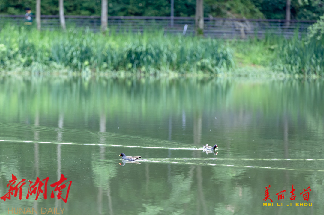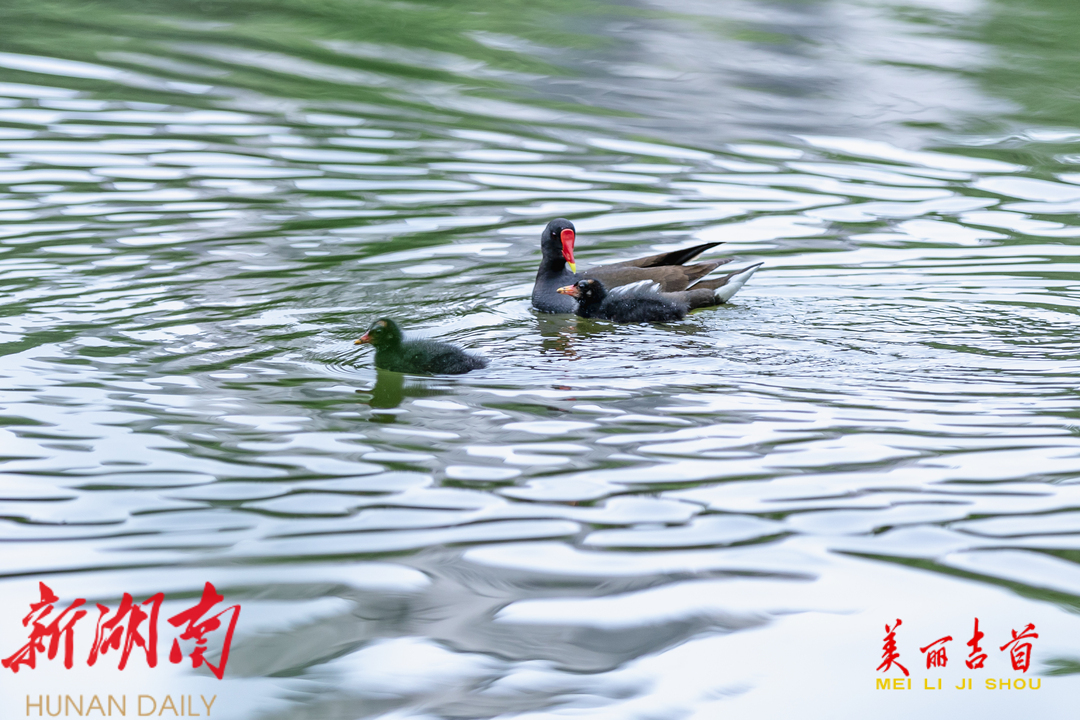 5月22日,国际生物多样性日,在吉首市乾州街道承芳湖里,黑水鸡在栖息觅食。近年来,该市深入推进生物多样性保护,生态环境持续改善,野生动植物数量不断增加、生物多样性稳步恢复,绘就了人与自然和谐共生的美好景象。