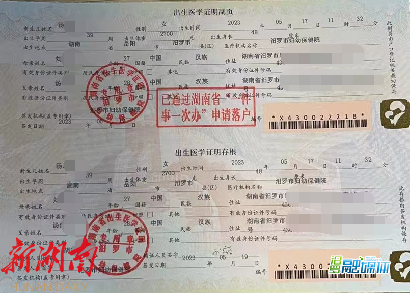 湖南日报·新湖南客户端5月23日讯(通讯员 张慧 周礼)近日,汨罗市的刘女士通过"湘易办"手机APP上的“新生儿出生一件事一次办”栏目成功进行了新生儿《出生医学证明》办理, 完成了小孩的户口、医保、社保参保登记。 这是汨罗市通过“湘易办”APP办理的首个“新生儿出生一件事一次办”业务,真正实现了“数据多跑路、群众少跑腿”。