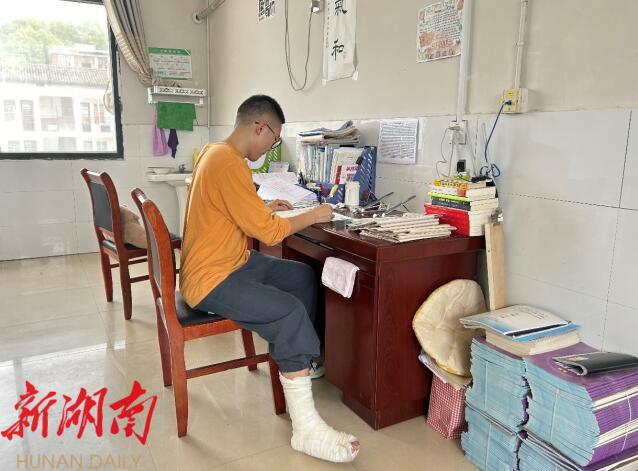 领导同事们看到,劝他请假回家休息,对此,他笑笑说:“我就是脚受了点小伤,没什么大不了的,你让我休息,我也只能成天躺床上,闲着也是闲着,还不如做点事。那两个班也适应了我的教学风格,中考在即,临时换人也不好。”拗不过他,校领导只得勉强答应他的要求。
