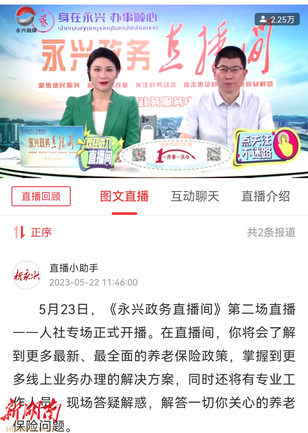 【永兴县融媒体中心5月24日讯】5月23号上午,永兴政务直播人社专场在永兴融媒体抖音号、永兴广电视频号、新永兴APP三大平台进行现场直播,活动邀请了永兴县人社局专业人员现场解答了市民关注的养老保险问题。