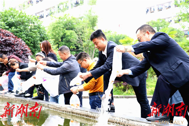 参加揭牌仪式的领导、教师代表在“知心屋”前合影,并来到龙山县皇仓中学中心广场观景池开展“放金鱼”活动。“让金鱼汇入池中,预示着新的开始和重生。”主持人一边与大家放金鱼、一边解说,希望来到知心屋的每一位来访者,都能通过心理健康老师的干预,自信、阳光、快乐地走出去。