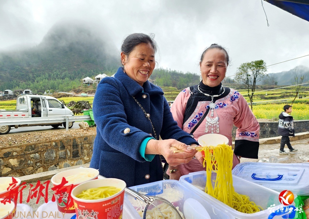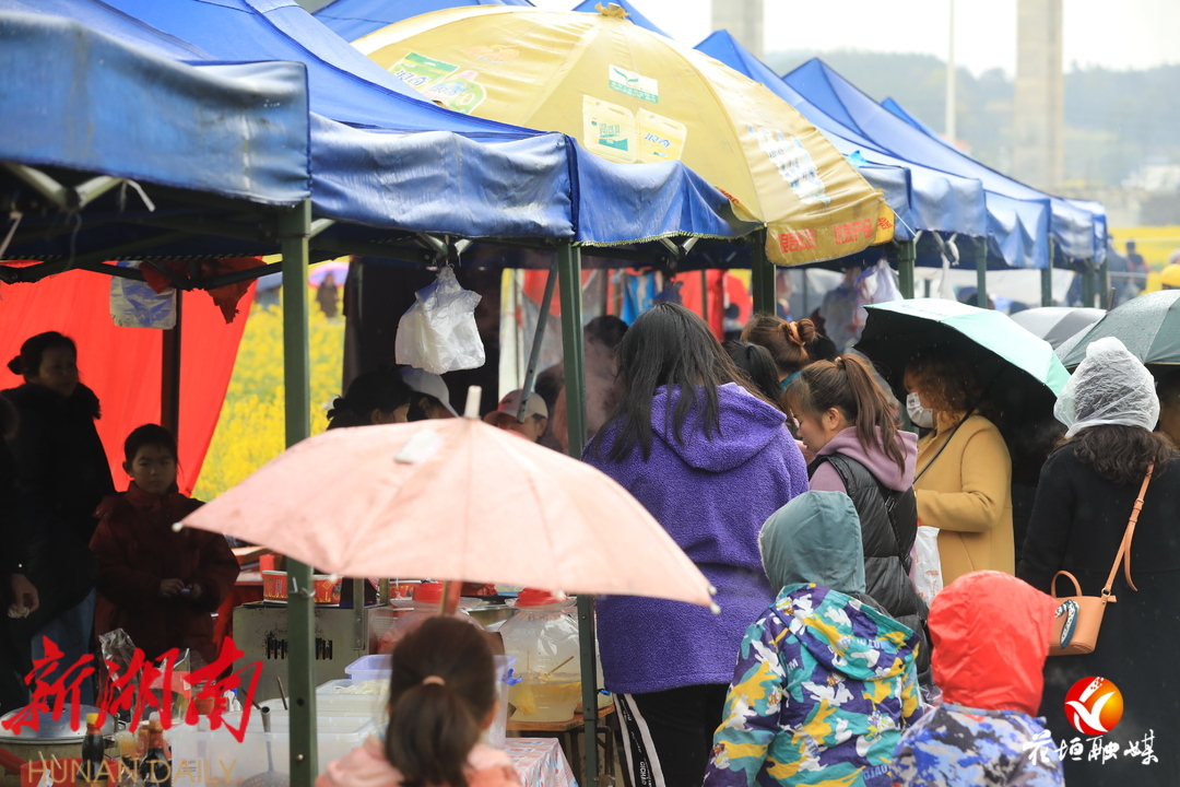 虽然天空下着蒙蒙细雨,但也阻挡不了游客游玩、赏花的脚步,被花田包围的苗族特色“吃货”体验区摆放着米豆腐、米粉、油粑粑等当地特色美食,倍受四面八方旅人青睐,纷纷驻足,一饱口福。