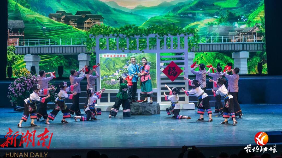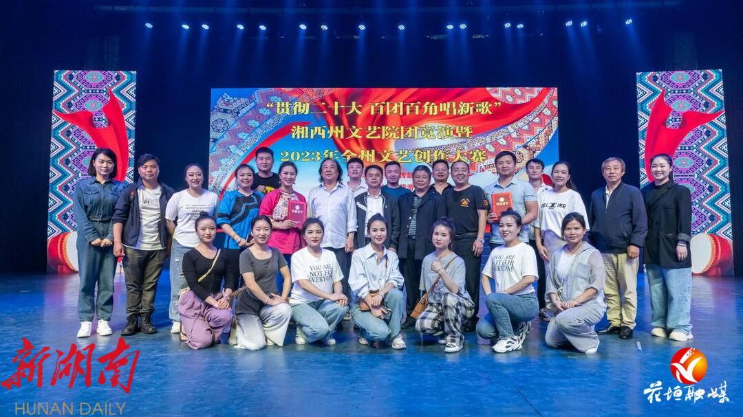 湖南日报·新湖南客户端5月17日讯(通讯员 蔡伟)5月16日,“贯彻二十大 百团百角唱新歌”湘西州文艺院团竞演暨2023年全州文艺创作大赛在湘西大剧院隆重举行。来自全州8县市、湘西高新区及州直相关单位19个主题鲜明、创意新颖、贴近群众、富有民族特色和地域特点的新创节目参加竞演。经过角逐,花垣县苗歌剧研究所报送的小型苗戏《钓村官》荣获一等奖,原创歌曲《春风从苗寨吹起》荣获二等奖,苗鼓说唱《苗家幸福来》参加“百团百角唱新歌”展演。