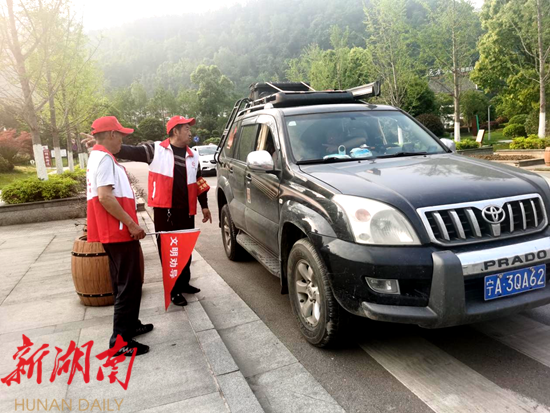 湖南日报·新湖南客户端 4月20日讯(通讯员 郁韵静 赵芳)“百丈峡右转后直行,几分钟就到了,晚上的灯光秀也值得一看呢”。4月19日下午,在张家界市武陵源城区主干道的高云公园路口,军地坪街道画卷路社区的“红袖章”文明督导队员正在解答银川市游客的路线咨询。