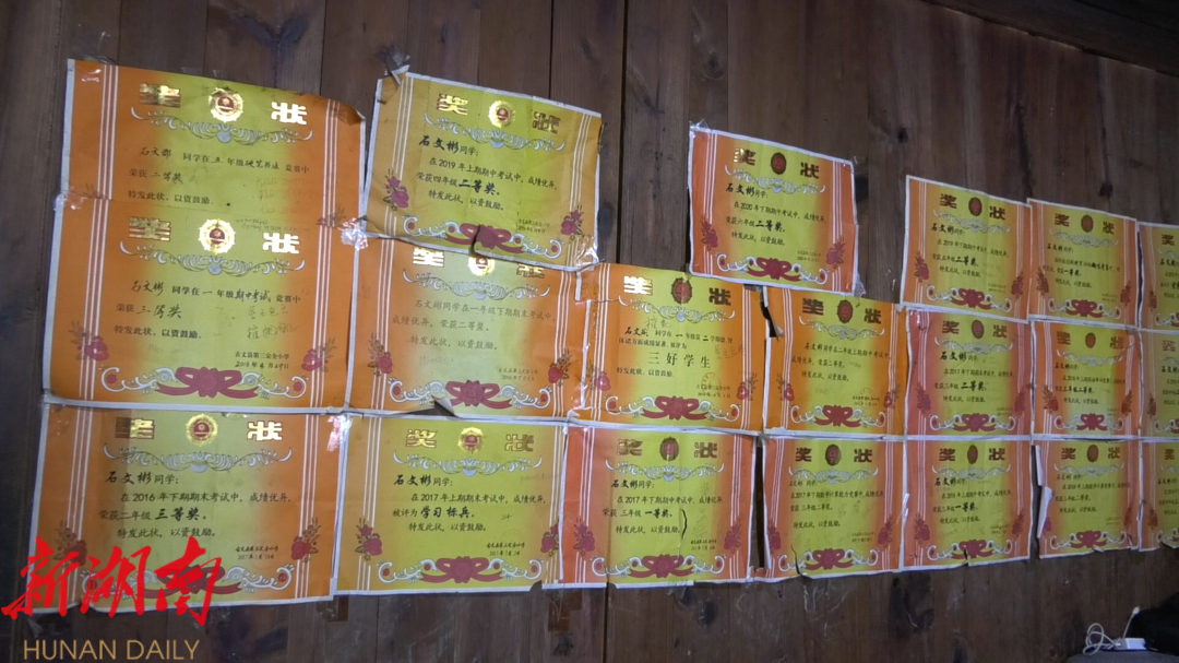 在石文彬的眼里,他的父亲是严格的,他总是对石文彬说“只有学习,才能改变现状,才能实现你的梦想,在这当中不要怕失败”。在父亲的教导下,石文彬在学习上丝毫不敢放松,课堂上认真听讲,积极回答老师问题,一到家就开始认真写作业,铺满墙壁的黄色奖状既是石光明对他的殷切期望,也是石文彬努力学习、不断前进的动力和证明。“每次看到他拿着奖状回来,我都很开心。我对他也感到自豪。”石光明转头看着墙上的奖状,高兴地说道。