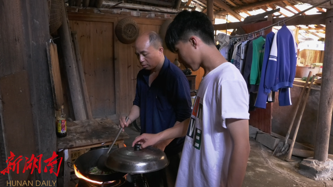 “他爸眼睛不能见路,他经常到我这买菜,牵着他爸手来这买菜,好听话懂事,是个优秀的孩子。”菜市场老板张大姐说。由于石光明不便外出,日常生活用品采购的责任就落在了石文彬身上。14岁的他,本应经常出现在游乐场,游戏厅,而他却成为了市场的常客。“取碗把那个四季豆捞起来给我。”炒菜时,石文彬总在一旁给爸爸打下手并提前做好了淘米、煮饭、洗菜等家务。吃饭时,他也总是先把爸爸的饭菜装好,自己才开始吃起来。他就像是照进这个家庭的一缕阳光,让整个家充满了温暖和希望,即使生活困难,他也笑着撑起了这个天。