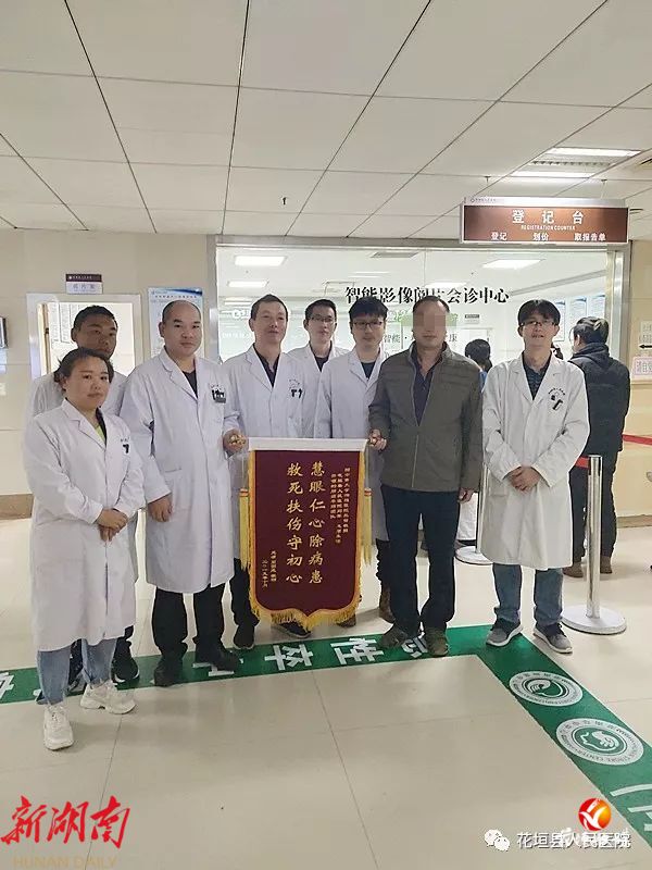 同年9月份,花垣某企业员工石某也是体检时胸部低剂量CT,发现10mm(毫米)大小结节,花垣项目组判别为Lung-RADS 4c级,“高危”,早期肺癌可疑。项目组为其开通绿色通道,2天后在湘雅附一住上了院,胸腔镜微创切除肺部结节,术后病理诊断 “肺腺癌,无转移” 。当医生告诉他,发现得早,治疗及时,可以达到治愈效果时,作为家里顶梁柱的石某,从担忧到惊喜,千恩万谢为放射科医护人员送上锦旗。