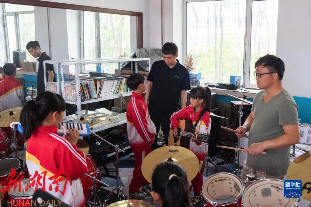 5月29日,在黑龙江省安达市任民镇中心小学,音乐老师指导音乐班的孩子进行乐队排练。新华社记者 谢剑飞 摄