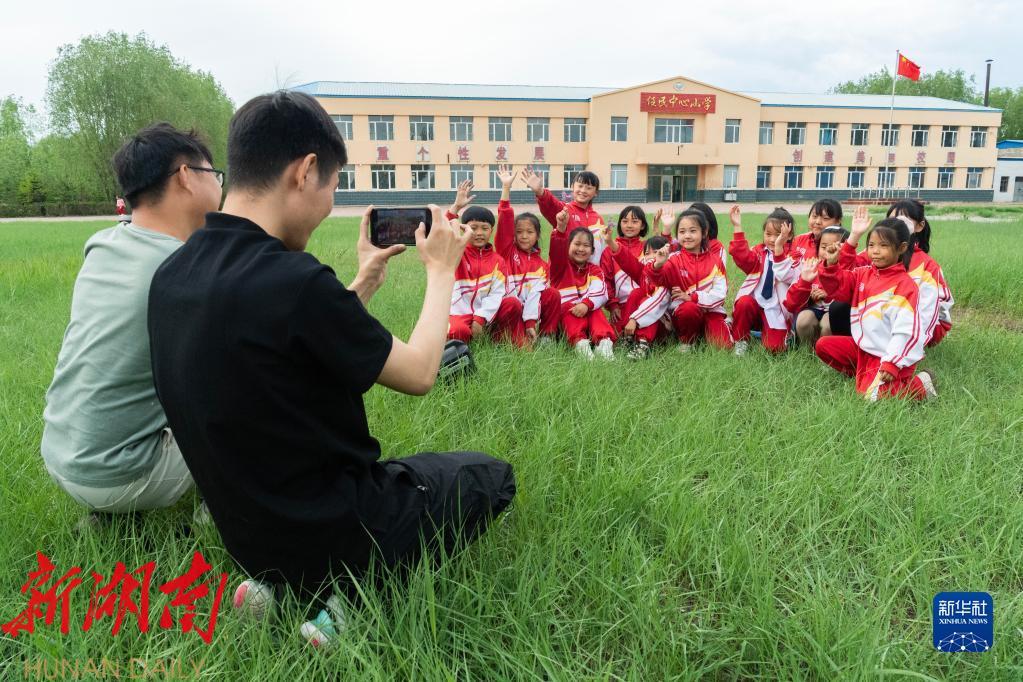 5月29日,在黑龙江省安达市任民镇中心小学校园的草坪上,音乐老师给音乐班的孩子们录制短视频。新华社记者 谢剑飞 摄