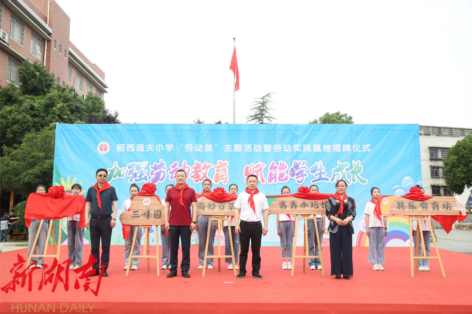 雨湖新闻网讯 (通讯员 吴镫)“聚焦劳动素养,赋能学生成长。”5月31日,在六一儿童节到来之际,韶西逸夫小学举行劳动美主题活动暨“两园一馆一坊”劳动实践基地揭牌仪式。副区长成学军,昭潭街道、区教育局、区教研培训中心相关负责人及韶西逸夫小学全体师生和家长代表参加活动。