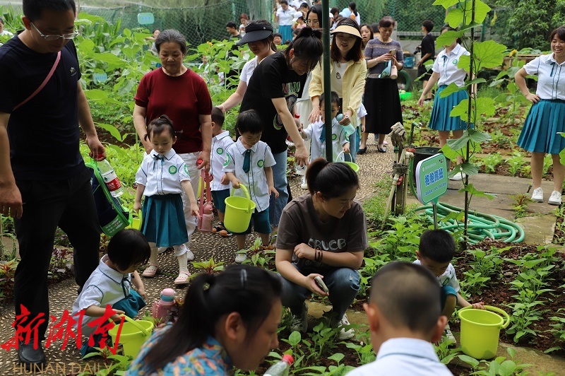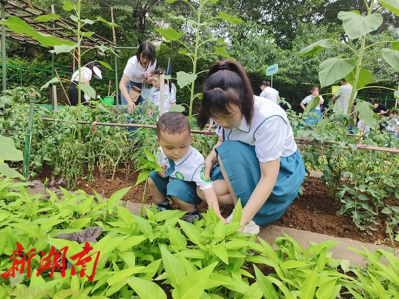 这方游戏气氛活跃,那厢菜园其乐融融。种植园内,幼儿易嘉乐与爸爸一起采摘空心菜,胖乎乎的小手上全是泥土。“父子一起享受种菜的快乐,这是学习教不了的。” 乐乐爸爸深有感触地说。