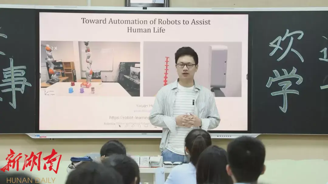 在高一2201班的教室里,2016届毕业生黄一轩受邀回到母校,就自己的成长经历、学习经验、研究成果等与学弟学妹进行分享。在2018年大二期间,他通过自身努力争取到了前往美国加州大学圣地亚哥分校学习的机会。在美学习的两年时间里,他倍加珍惜这来之不易的机会,夜以继日投入学习工作之中。2020年大学毕业后,他以优异成绩进入美国犹他大学计算机系攻读博士学位。截至目前,他以第一作者身份在国际顶级会议上发表学术论文两篇,并获得会议最佳论文提名奖一次。他的研究主要聚焦在机器人抓取与操作以及深度学习在机器人上的应用。