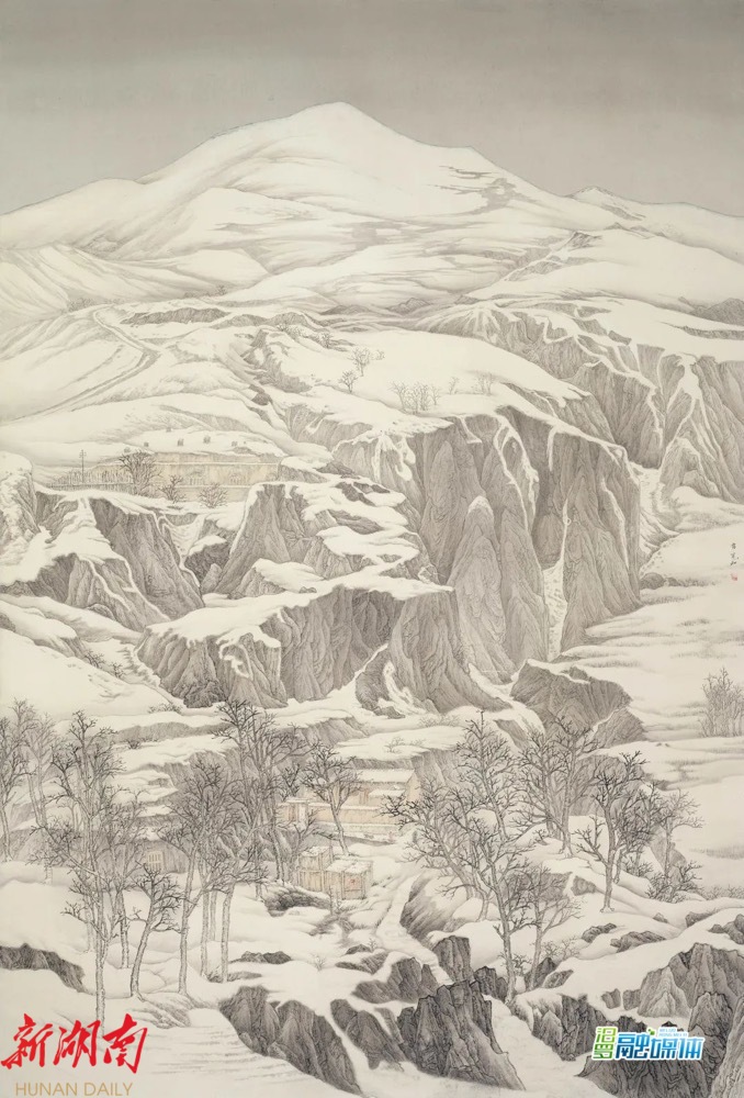 瑞雪兆丰年。作品《丰年》来自于大自然,也脱化于画者对自然的思考,其物象表达,乃至气象技法的生成,都极富生命力。以古法用笔,水墨交融,正大而不失精微,含蓄显露峥嵘,开合有度、虚实有无,以自然造化为师且师古不泥古。