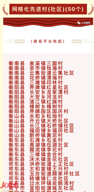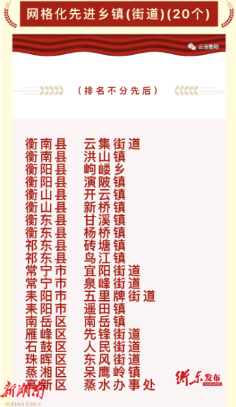衡东融媒6月7日讯(融媒体记者 文灿)近日,记者从衡东县社会治理和网格化信息中心获悉,为总结经验、表彰先进,经各级各单位采取自下而上、上下结合的方式进行考察推荐,市平安建设领导小组办公室研究决定,授予衡山县、南岳区“网格化先进县市区”称号, 授予衡南县云集街道等 20 个单位“网格化先进乡镇(街道)”称号,授予衡南县泉溪镇三圆村等 50 个村(社区)“网格化先进村社”称号,授予廖炫云等 100 名同志“最美网格员”称号,其中, 我县2个乡镇、5个村社区、10个个人荣获殊荣,名单公布如下: