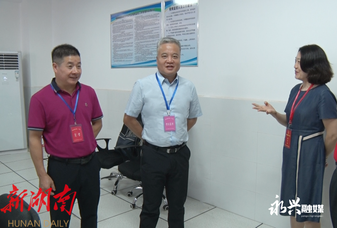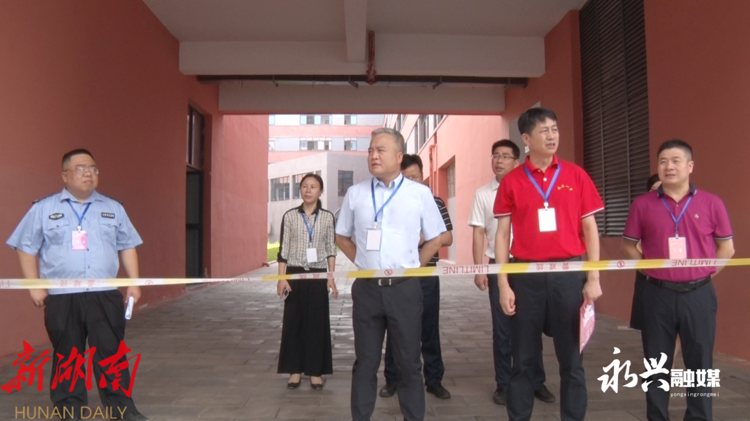 在永兴一中考点,考务人员各司其职,高考各项工作正紧张有序地进行。刘朝晖来到考生入场安全通道、考点视频监控室等重点场所进行查看,详细了解考务安排、考生人数、安全保密、交通疏导、应急处置等情况。
