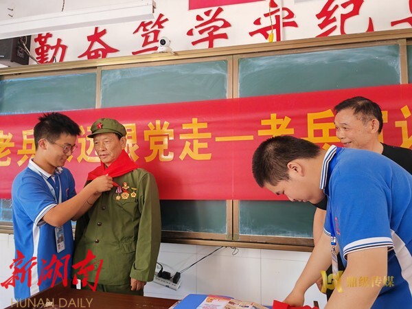宣讲结束后,学生代表为两位老兵系上鲜艳的红领巾,镇退役军人服务站工作人员向学生发放宣传手册,引导学生爱党爱国爱军,将爱国种子厚植青少年心中。