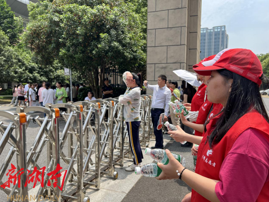 第一场考试结束后,志愿者们主动来到考点门口,为考生们送到矿泉水、牛奶等物资。