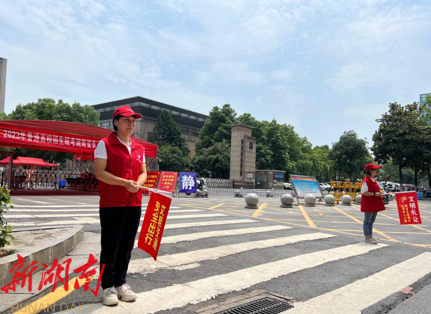 为积极营造一个安静舒适的考试环境,志愿者们主动在路口进行文明志愿劝导。