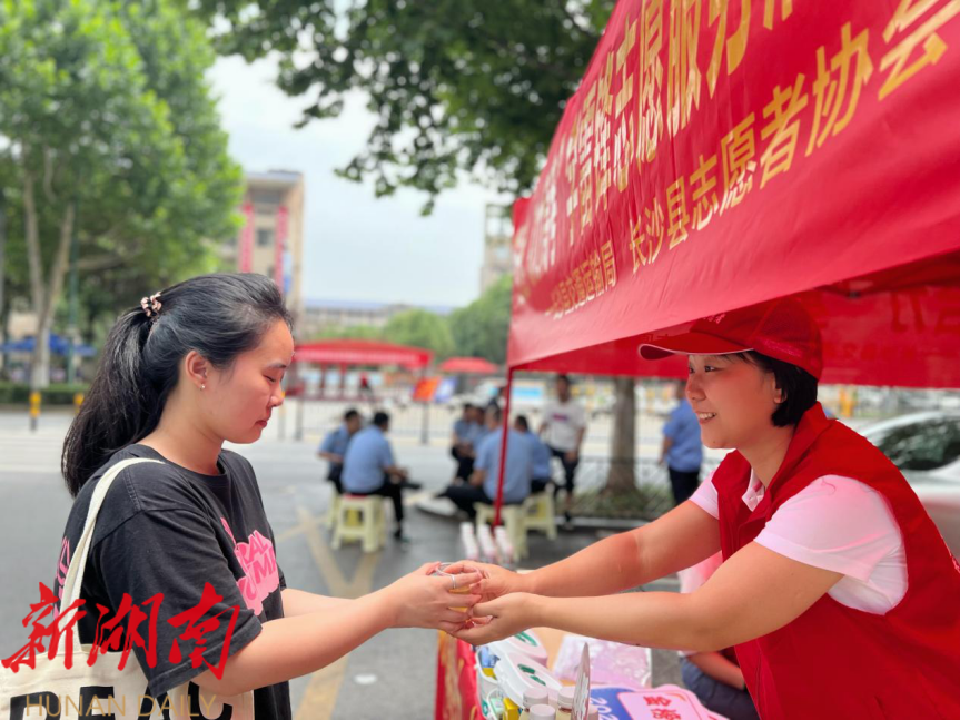 志愿者为考生及考生家长朋友送上消暑凉茶。