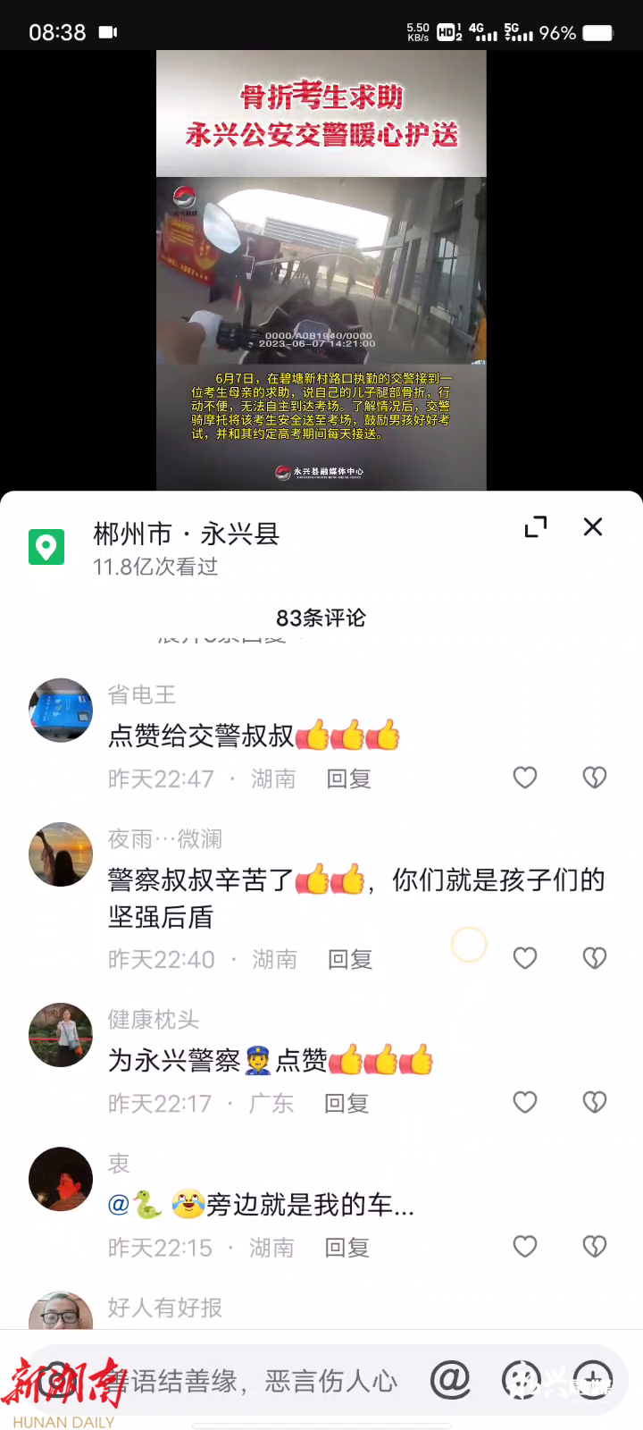 【永兴县融媒体中心6月8日讯】6月7日,一位考生母亲求助交警,希望能帮助腿部骨折的儿子前往考场参加高考,在碧塘新村路口执勤的交通民警听到这个消息后便迅速采取行动,将考生送上警用摩托车,并亲自将其安全送到考场。事情发生后引发了网友热议和点赞。