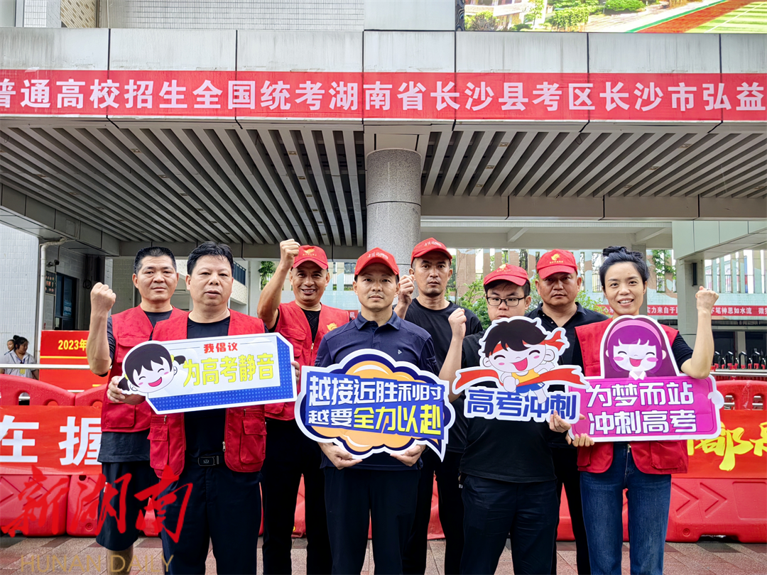 6月7日,高考第一天,在长沙县一中考点,“星沙好人”王楚建冒着酷热参与护考行动。除了到考点服务外,王楚建还经常在居住小区周边的公园、KTV娱乐场所等开展“静音”宣传。