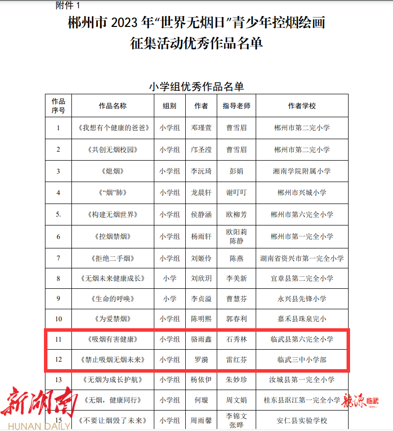 据悉,本次征集活动由健康郴州行动推进办与市教育局联合举办,围绕今年第36个世界无烟日“无烟为成长护航”主题,在全市范围内征集青少年控烟绘画作品,从各县市区卫生健康局选送并经专家评选小学组优秀作品15幅、中学组优秀作品16幅,旨在为广大青少年健康成长营造无烟、清洁、健康的生长环境。