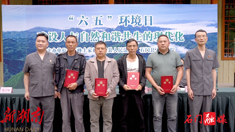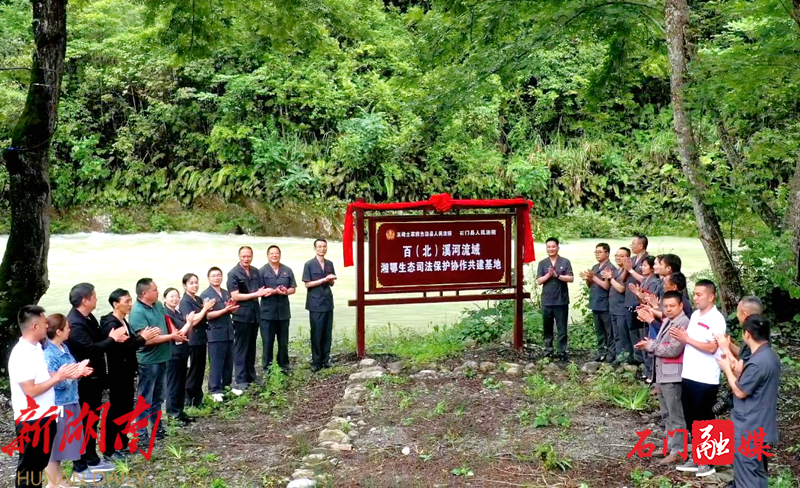 在五峰百溪河社区,石门法院和五峰法院主要负责人共同为“百(北)溪河流域湘鄂生态司法保护协作共建基地”揭牌,并为环境资源审判工作联络员颁发聘书。