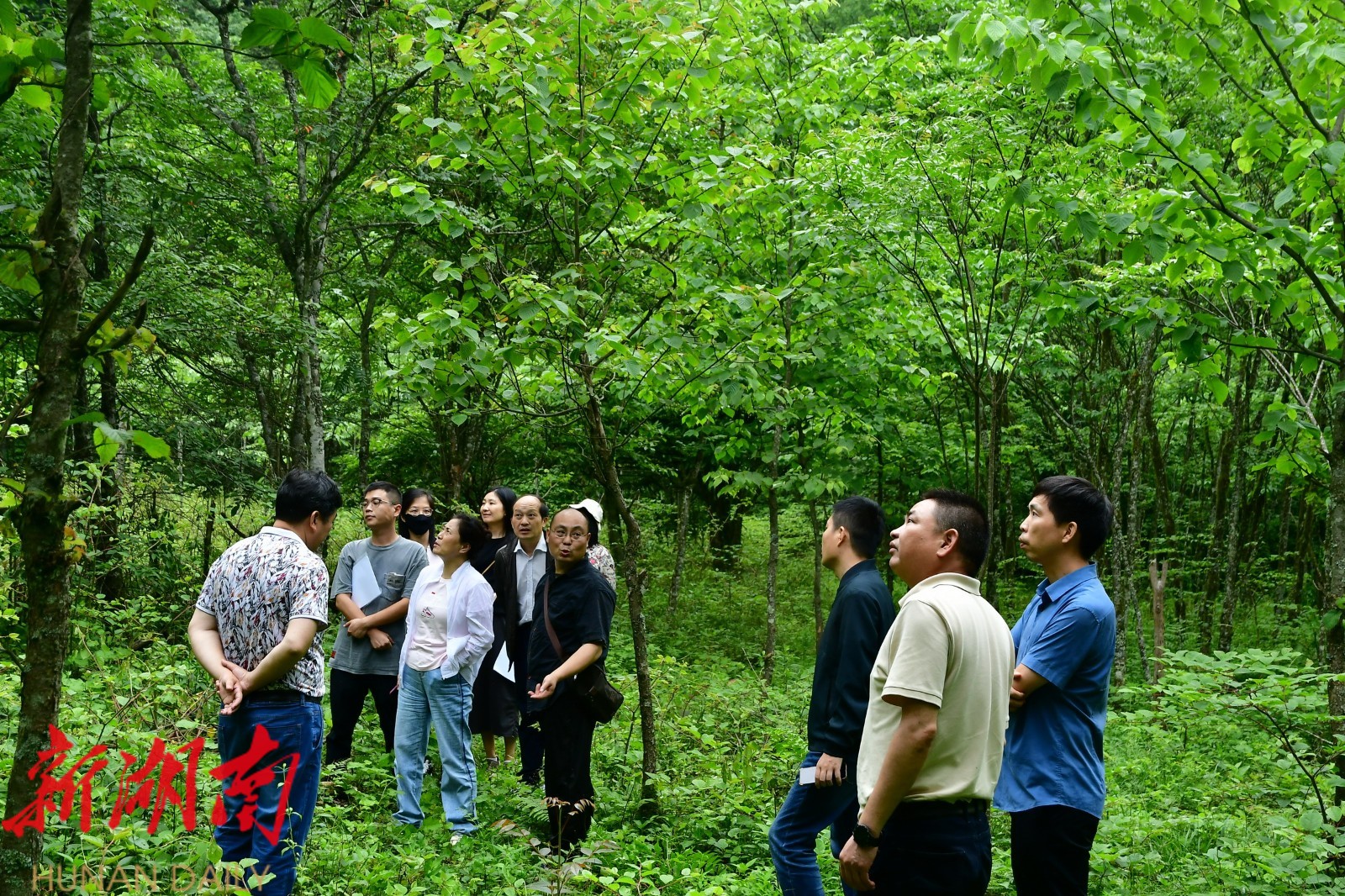 胡俊东一行实地查看八大公山国家级 自然保护区天平山林区内野生植物长势情况,详细了解珙桐、长果安息香等野生植物生长习性及具体立地条件,并就如何开展湖南亚高山植物引种工作达成初步意向。