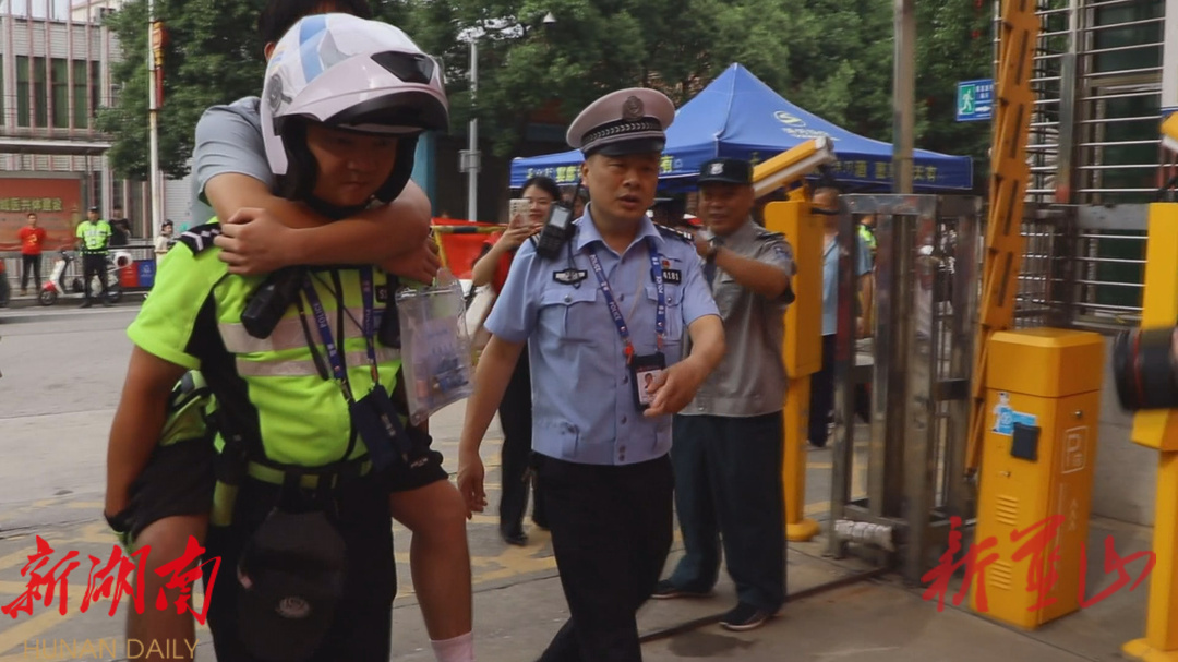 6月7日早上7时许,来自蓝山县职业中专2026班高三考生朱涛因不久前打篮球,不慎脚踝扭伤,行动不便,在了解情况后,学校立即向当地招生考试委员会报备。在8时15分,朱涛由交警搀扶上警车,一路畅通无阻驶往考点,蓝山县交警部门为朱涛提供的“一对一”贴心服务,让他感到十分暖心。