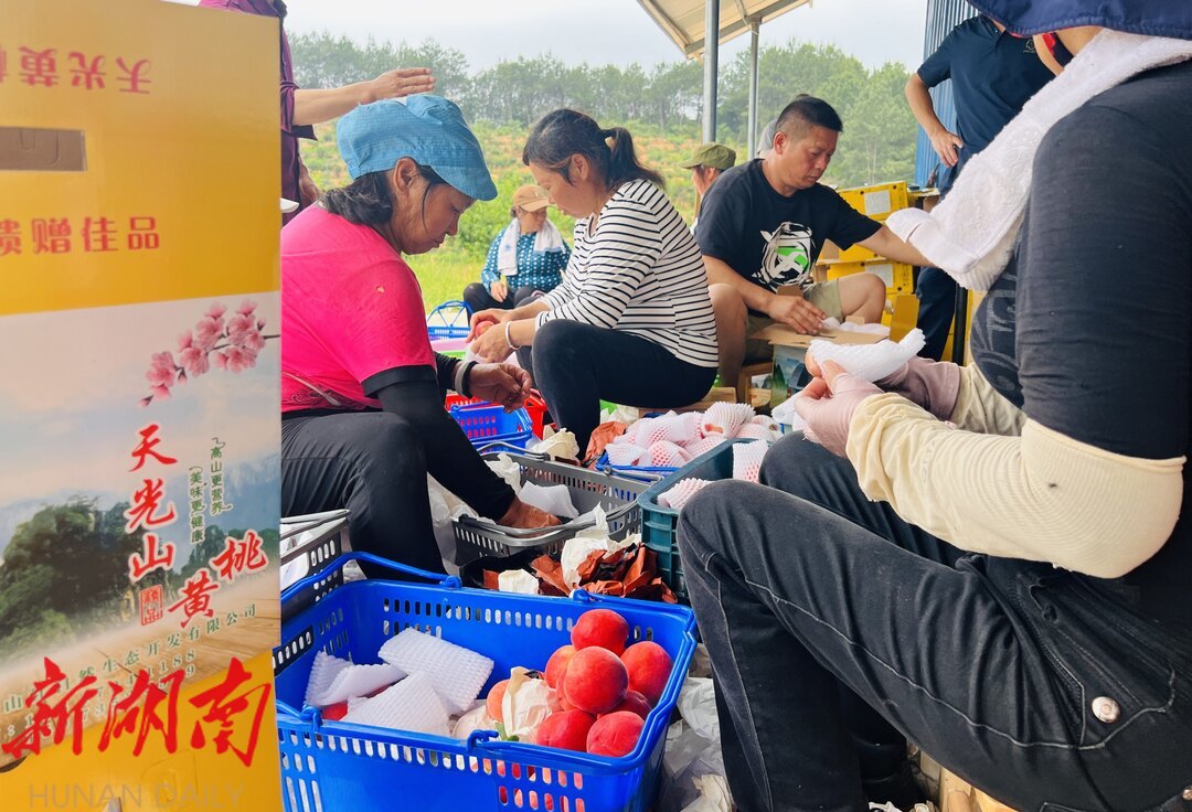 今年产量不错,预计桃园可收获24万斤桃子,收入达240万元。当前已进入桃子采摘期,孙靖说许多老顾客纷纷投来了订单,基地请了周边村民采摘、打包新鲜蜜桃,销往长沙、浙江、北京和附近商超,广受好评。