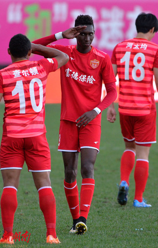 图为:延边长白山队球员斯蒂夫(中)在庆祝进球